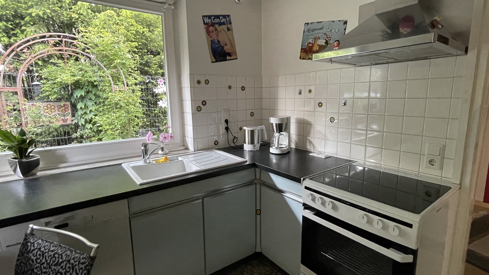 Ein Ausklapp-Tisch mit zwei Sitzgelegenheiten, Spülmaschine, Ceranherd, Mikrowelle, Wasserkocher, Kaffeemaschine, Toaster, usw. machen die Küche zum gemütlichen Aufenthaltsort.