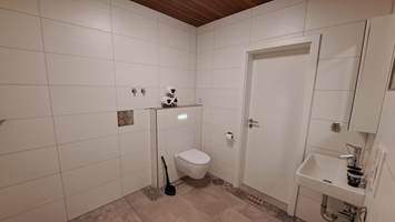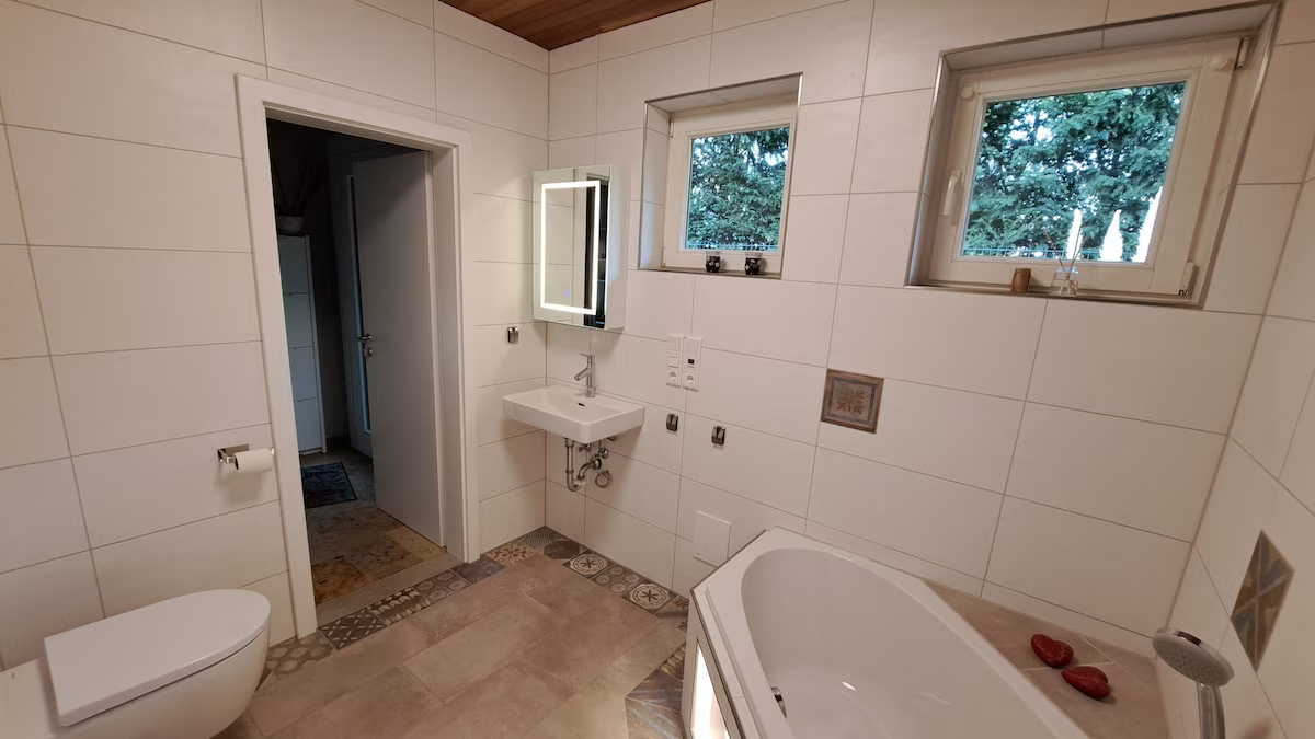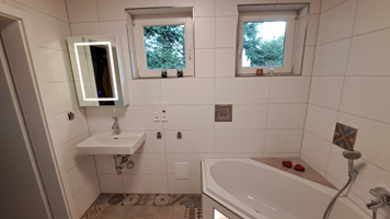 Sie finden dort eine kleine Eck-Badewanne und eine geräumige Dusche (1,00m x 1,00m) vor.