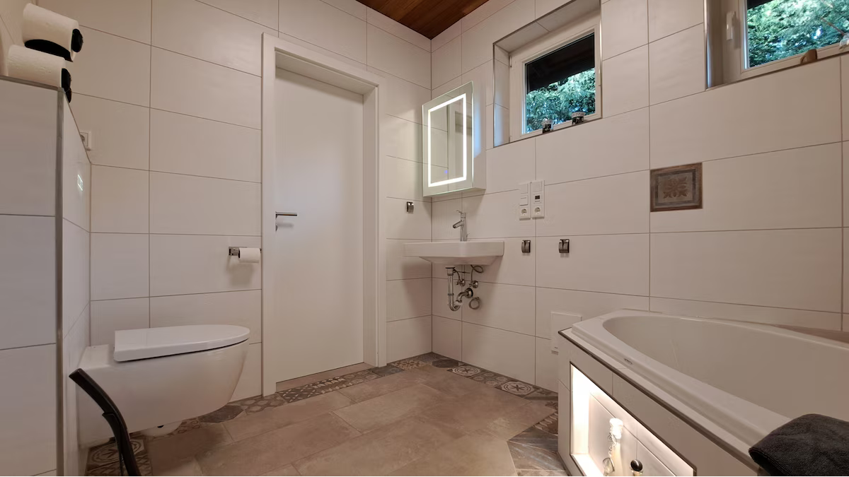 Sie finden dort eine kleine Eck-Badewanne und eine geräumige Dusche (1,00m x 1,00m) vor.
