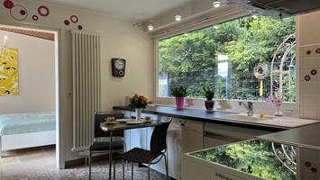 Ein Ausklapp-Tisch mit zwei Sitzgelegenheiten, Spülmaschine, Ceranherd, Mikrowelle, Wasserkocher, Kaffeemaschine, Toaster, usw. machen die Küche zum gemütlichen Aufenthaltsort.